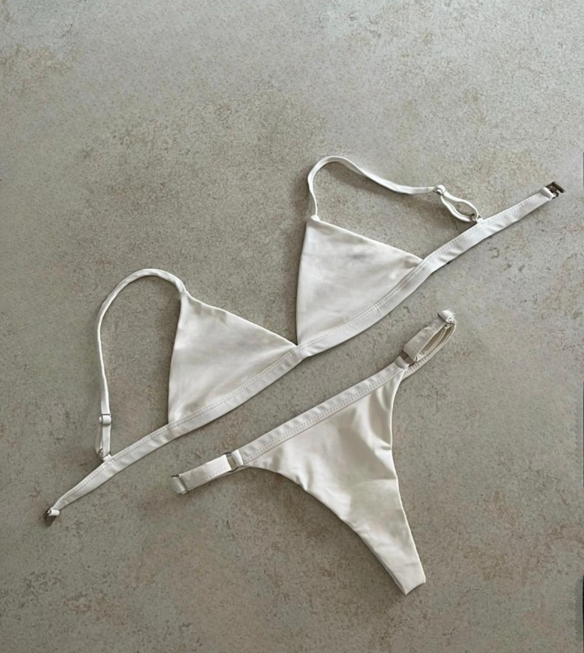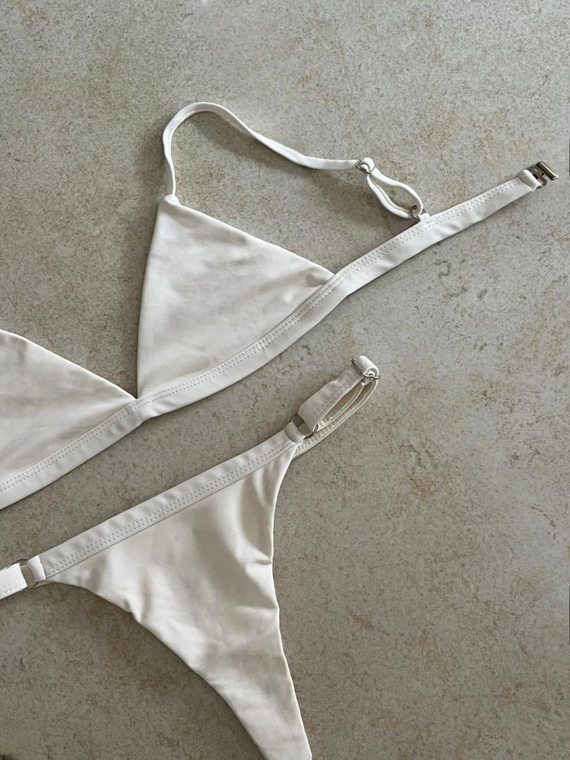 Triangulito fijo con breteles regulables y broche en la espalda. Bombacha less regulable con doble forrería. El top cuenta con huecos para colocar tazas desmontables.