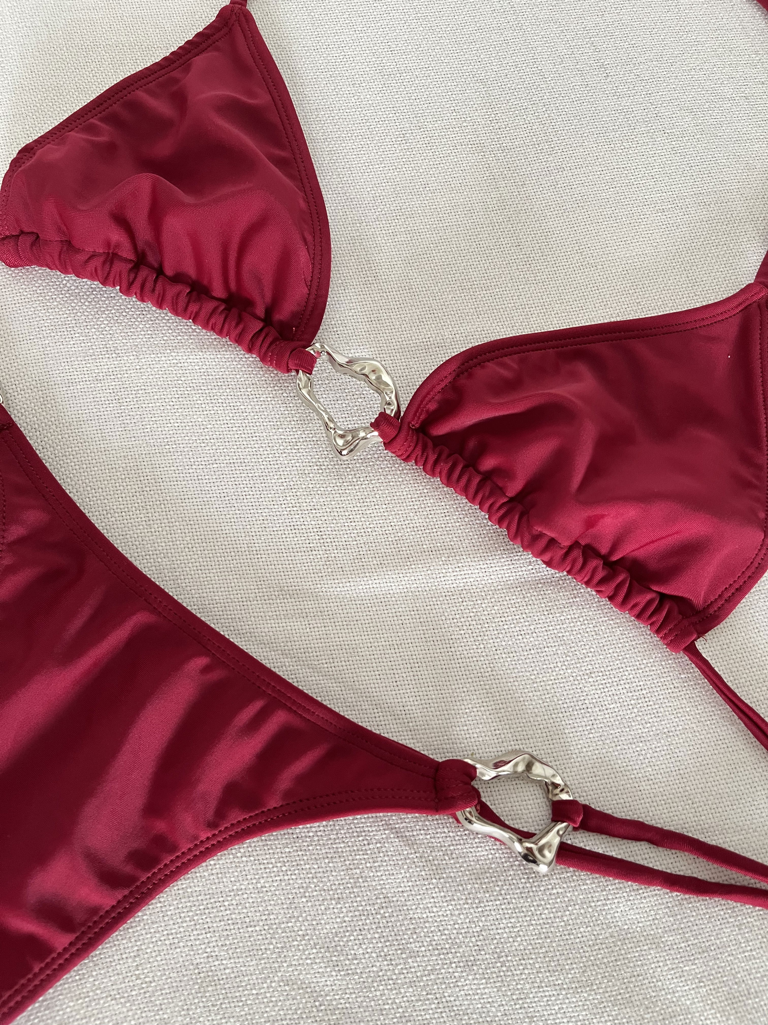 - Corpiño de triángulo movible forrado, con abertura para taza, y breteles regulables para atar. Avío de zamac plateados los cuales no calientan ni queman al sol, cada avío mide 4,5x3 cm aprox