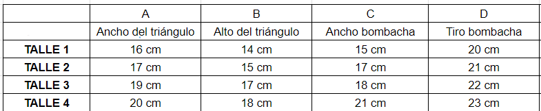 - Talle 1: 85 de busto, talle 2: 90 de busto, talle 3: 95 de busto, talle 4: 100/105